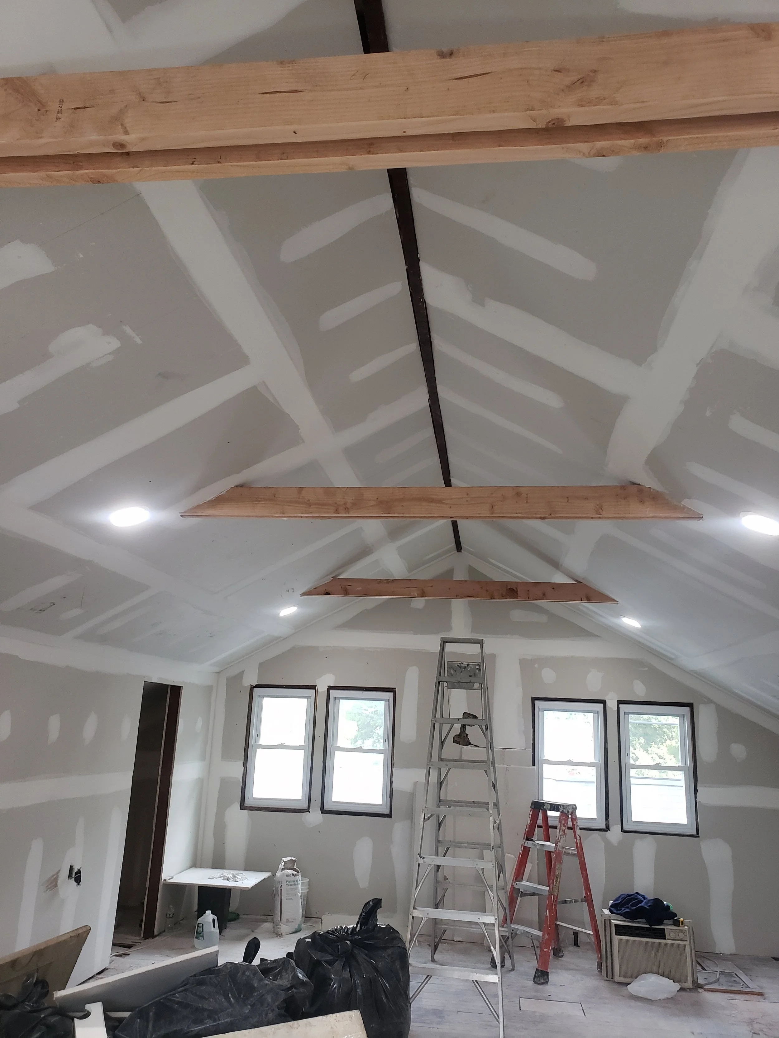 Interior of a room under construction with unfinished drywall, two windows, ladders, construction materials, and wooden beams installed on the ceiling.