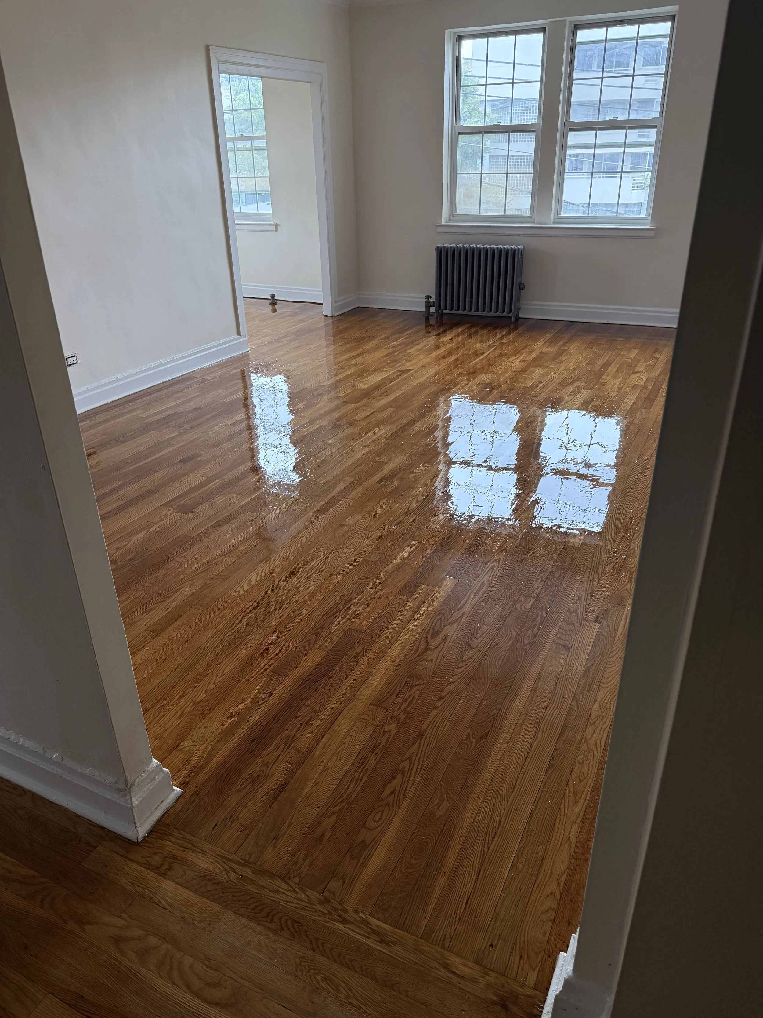 An empty room with hardwood flooring, beige walls, large windows, and a black radiator.