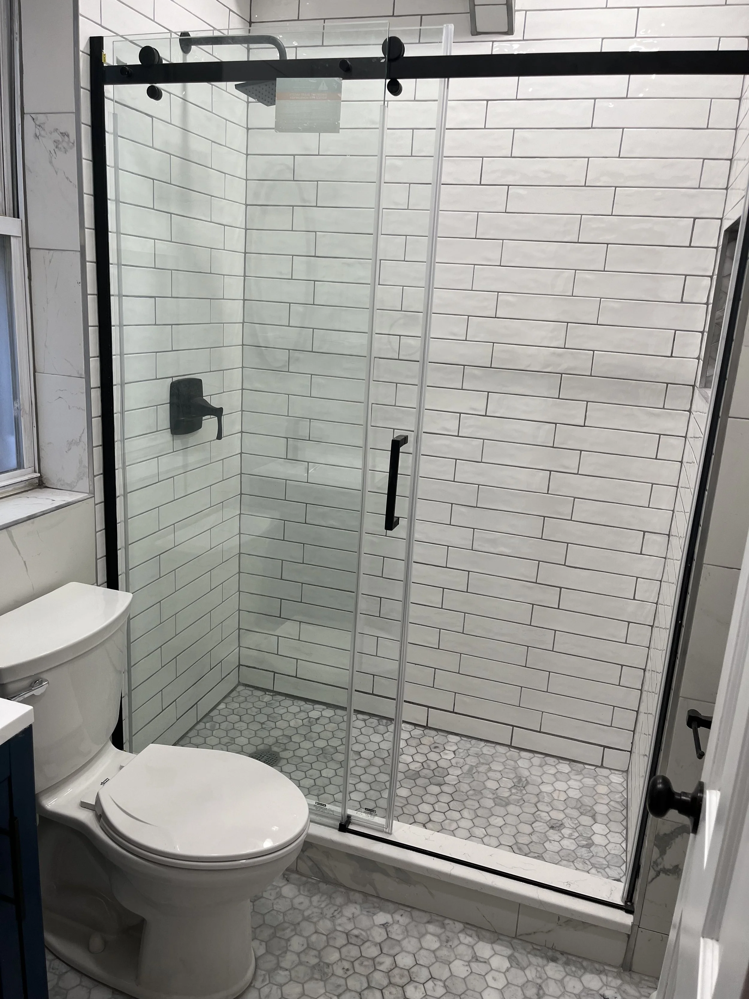 Bathroom with a glass shower enclosure, white subway tile walls, hexagonal floor tiles, and a toilet next to a small blue cabinet.
