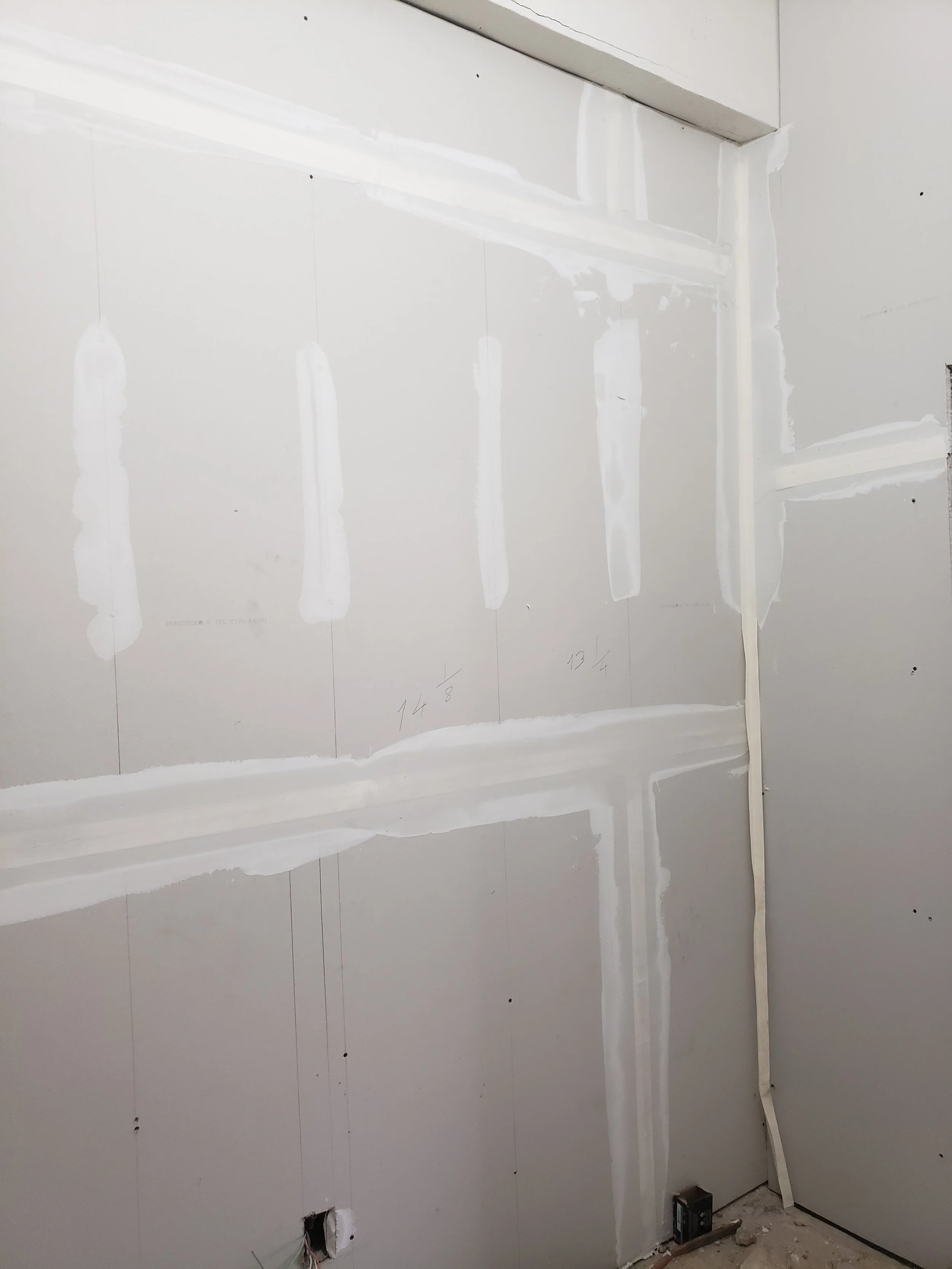 Interior wall under construction with drywall and joint compound, with markings and an electrical outlet opening.